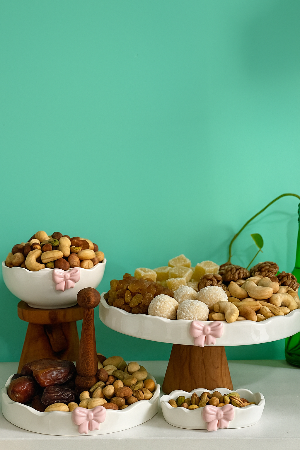 کاسه آجیل پایه چوبی پاپیون صورتی جنس سرامیک دستساز