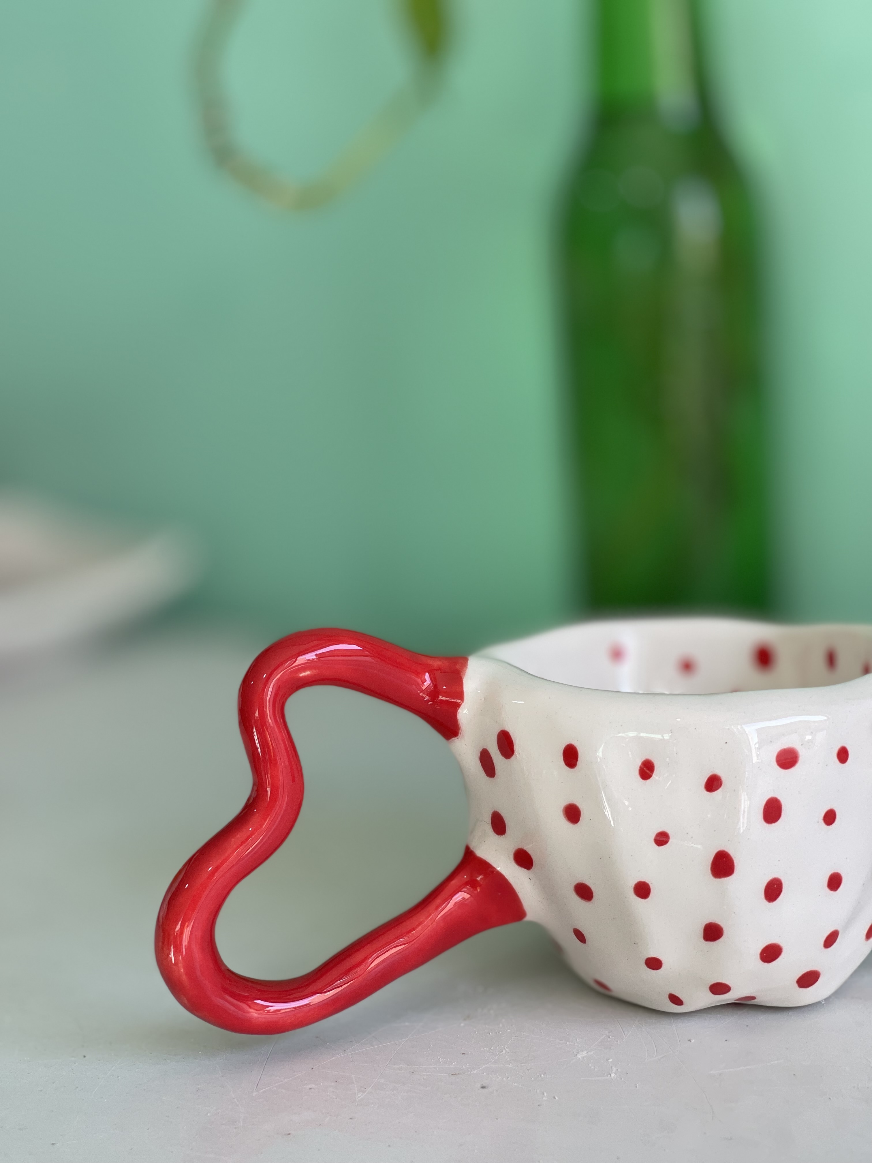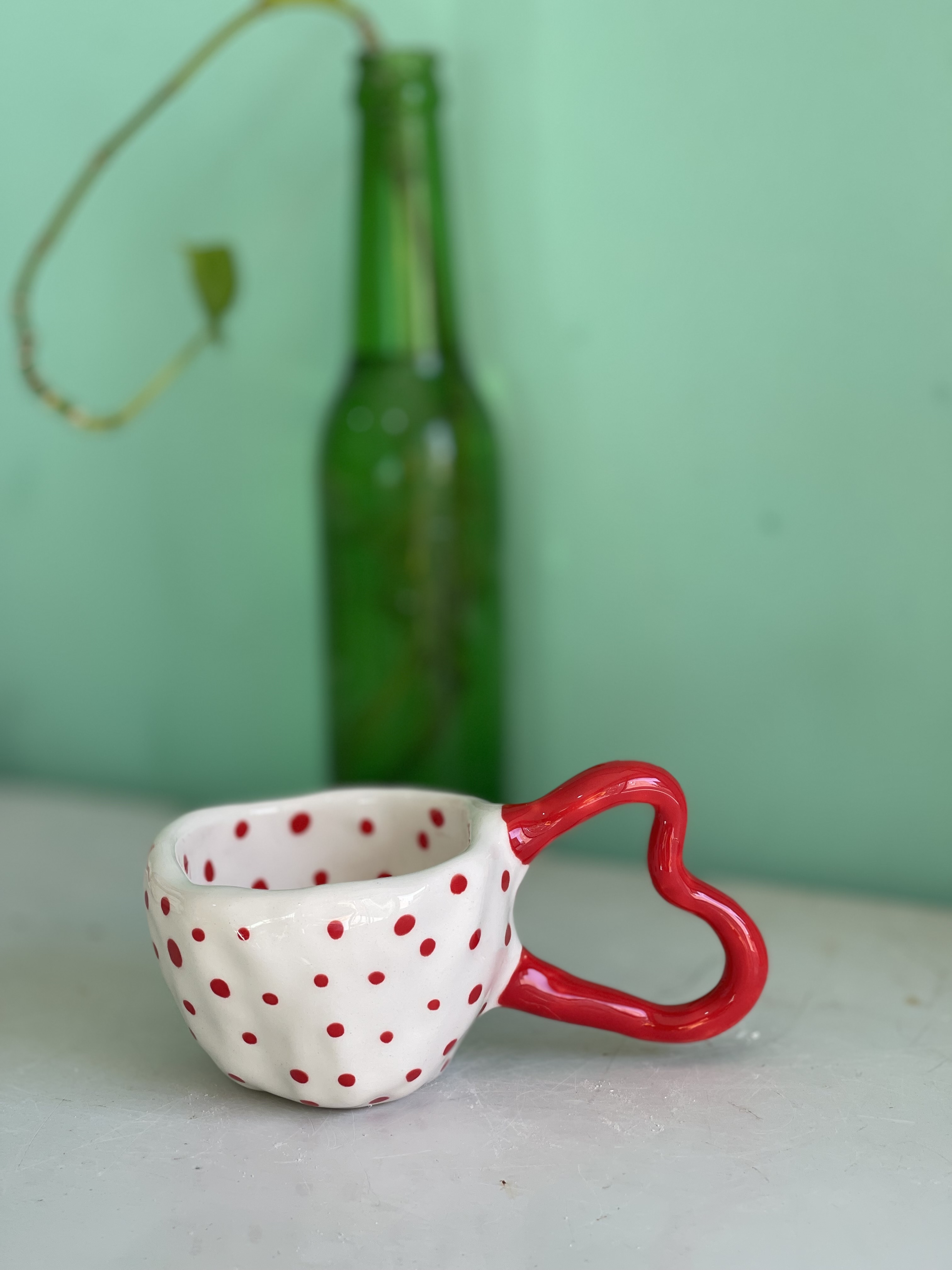 فنجان اسپرسو دفورمه دسته قلبی خال خالی جنس سرامیک دستساز
