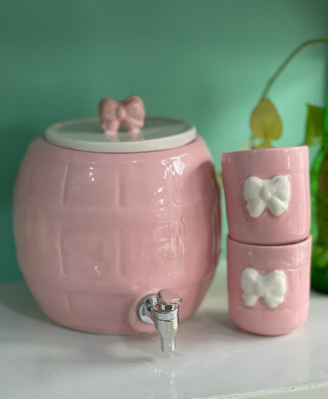 ست کلمن 4لیتر صورتی و لیوان آبخوری پاپیون جنس سرامیک دستساز