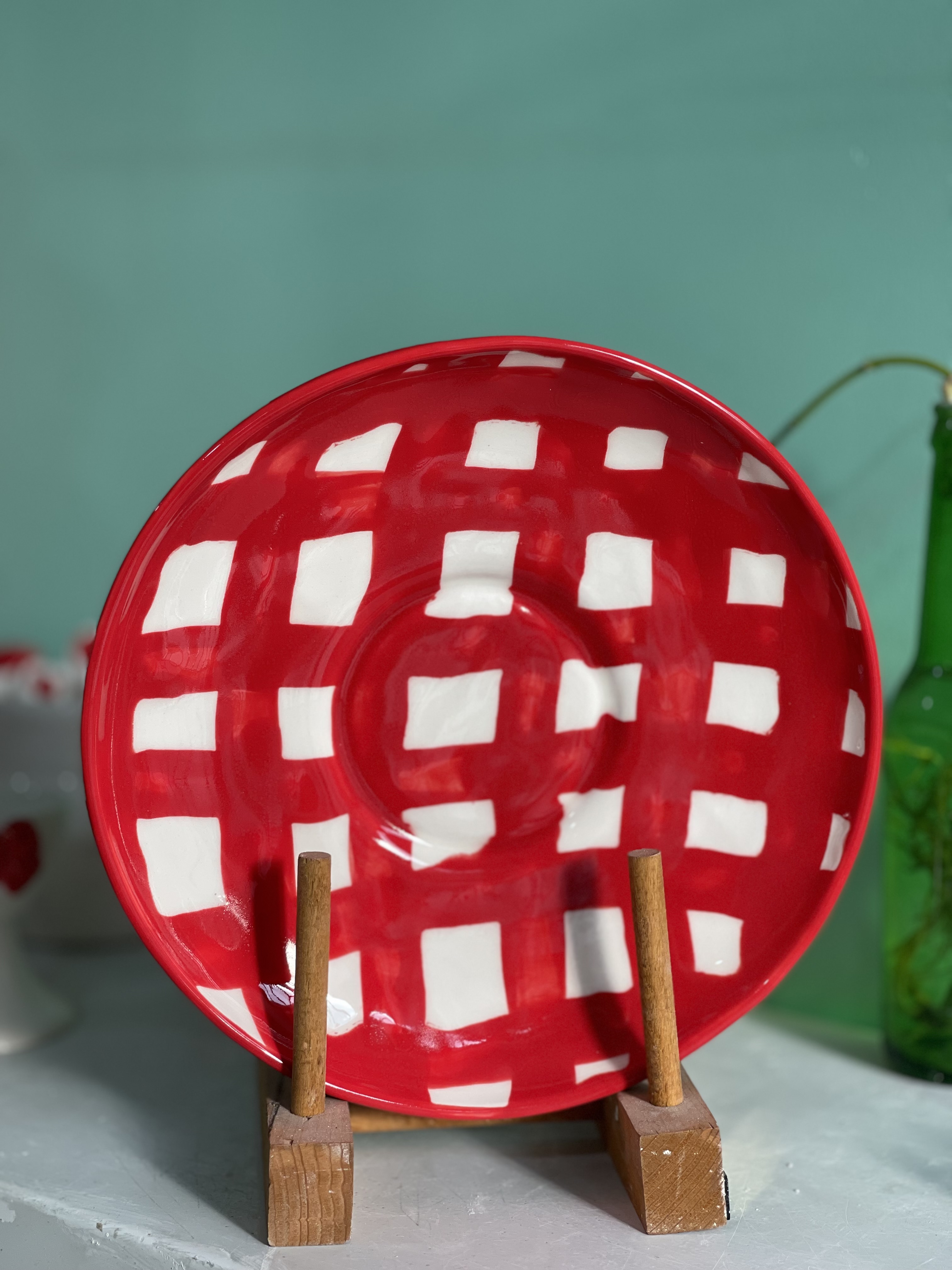 تخته سرو چهارخونه قرمز جنس سرامیک دستساز بشقاب تخت قطر 20